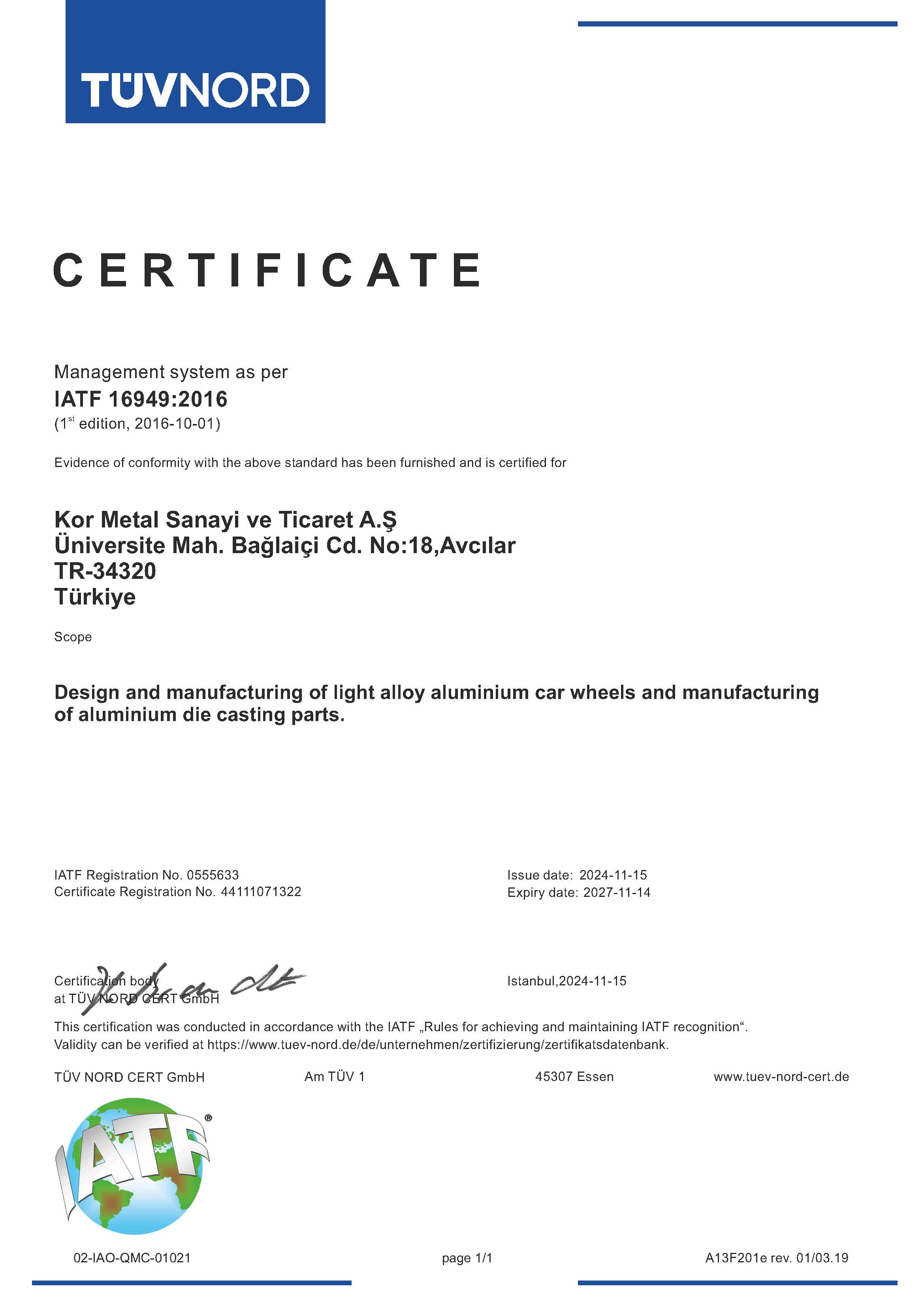 Üretiminde kaliteyi daima ön planda tutan Kormetal’in, üretim sürecinde ürünlerinin kontrolü Kalite Müdürlüğü tarafından yapılmaktadır. Üretilen jantlar ve alüminyum döküm parçalar 3 boyutlu ölçüm cihazlarıyla otomatik olarak ve geçer/geçmez mastarlarla manuel olarak kontrol edilir.